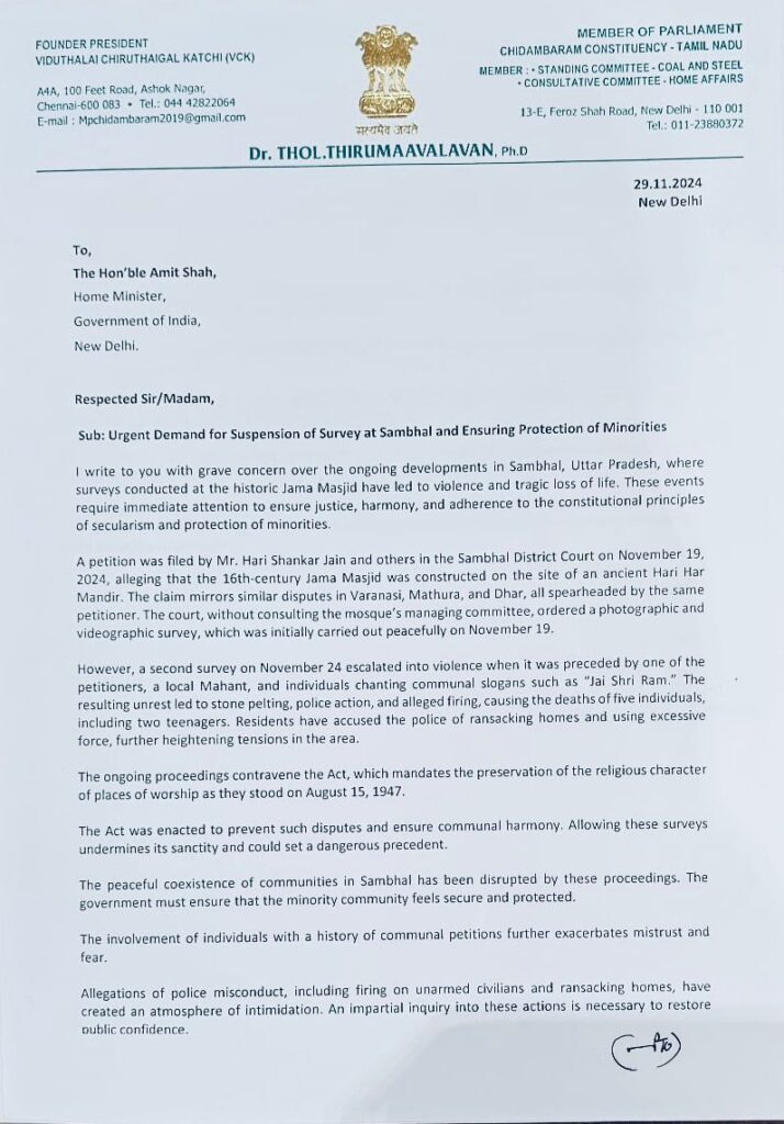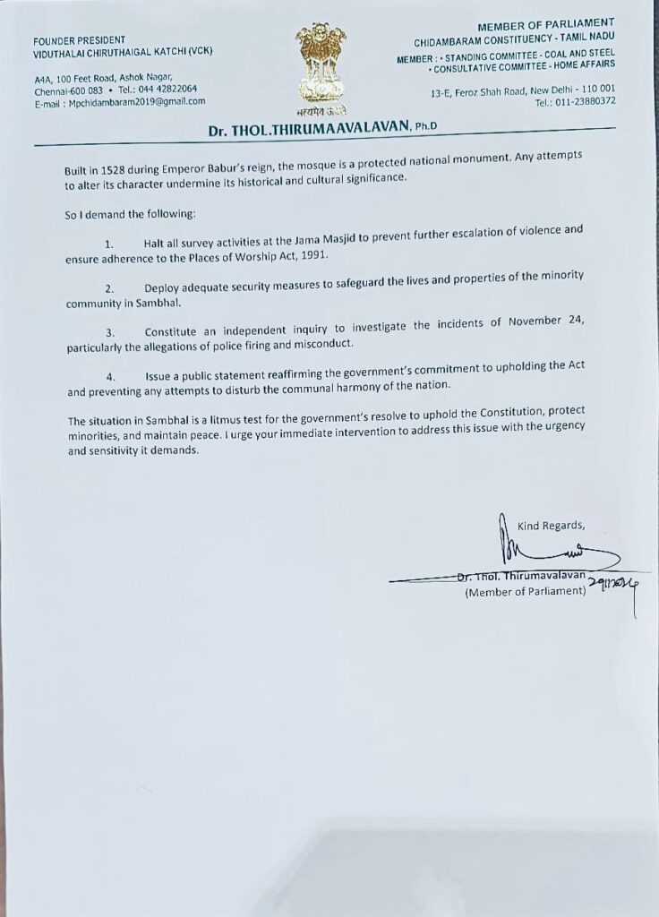 “உத்தரப்பிரதேச மாநிலம் சம்பலில் உள்ள ஜாமா மஸ்ஜித்தின் கீழே இந்துக் கோயில் இருந்ததா என்பதை அறிவதற்காக மேற்கொள்ளப்பட்டிருக்கும் ஆய்வுப்பணிகளை உடனே நிறுத்த வேண்டும்”