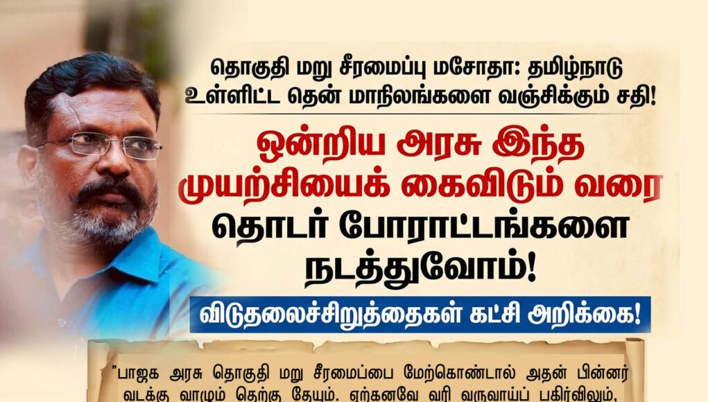 ஒன்றிய அரசின் நடவடிக்கையைக் கண்டித்து நாடு முழுவதும் கறுப்புக் கொடி ஏந்தி ஆர்ப்பாட்டங்களை நடத்த வேண்டும் என மதச்சார்பற்ற முற்போக்குக் கூட்டணியின் தலைவர் திரு மு.க.ஸ்டாலின் அவர்கள் அழைப்பு விடுத்துள்ளார். அதை விடுதலைச் சிறுத்தைகள் வழிமொழிகிறது. தொகுதி மறு சீரமைப்பு மசோதா நாடாளுமன்றத்தில் தாக்கல் செய்யப்படும் 16 4 2026 அன்று விடுதலை சிறுத்தைகள் கட்சியின் பொறுப்பாளர்கள் தமிழ்நாடு முழுவதும் கறுப்புக்கொடி ஆர்ப்பாட்டங்களை நடத்த வேண்டும். கட்சி அலுவலகத்திலும், தமது வீடுகளிலும் கறுப்புக் கொடி ஏற்றி எதிர்ப்பைத் தெரிவிக்க வேண்டும் எனக் கேட்டுக்கொள்கிறேன்