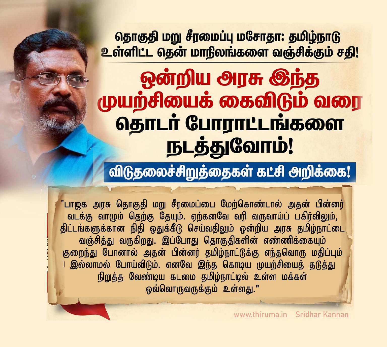 பாஜக அரசு தொகுதி மறு சீரமைப்பை மேற்கொண்டால் அதன் பின்னர் வடக்கு வாழும் தெற்கு தேயும். ஏற்கனவே வரி வருவாய்ப் பகிர்விலும், திட்டங்களுக்கான நிதி ஒதுக்கீடு செய்வதிலும் ஒன்றிய அரசு தமிழ்நாட்டை வஞ்சித்து வருகிறது. இப்போது தொகுதிகளின் எண்ணிக்கையும் குறைந்து போனால் அதன் பின்னர் தமிழ்நாட்டுக்கு எந்தவொரு மதிப்பும் இல்லாமல் போய்விடும். எனவே இந்த கொடிய முயற்சியைத் தடுத்து நிறுத்த வேண்டிய கடமை தமிழ்நாட்டில் உள்ள மக்கள் ஒவ்வொருவருக்கும் உள்ளது.